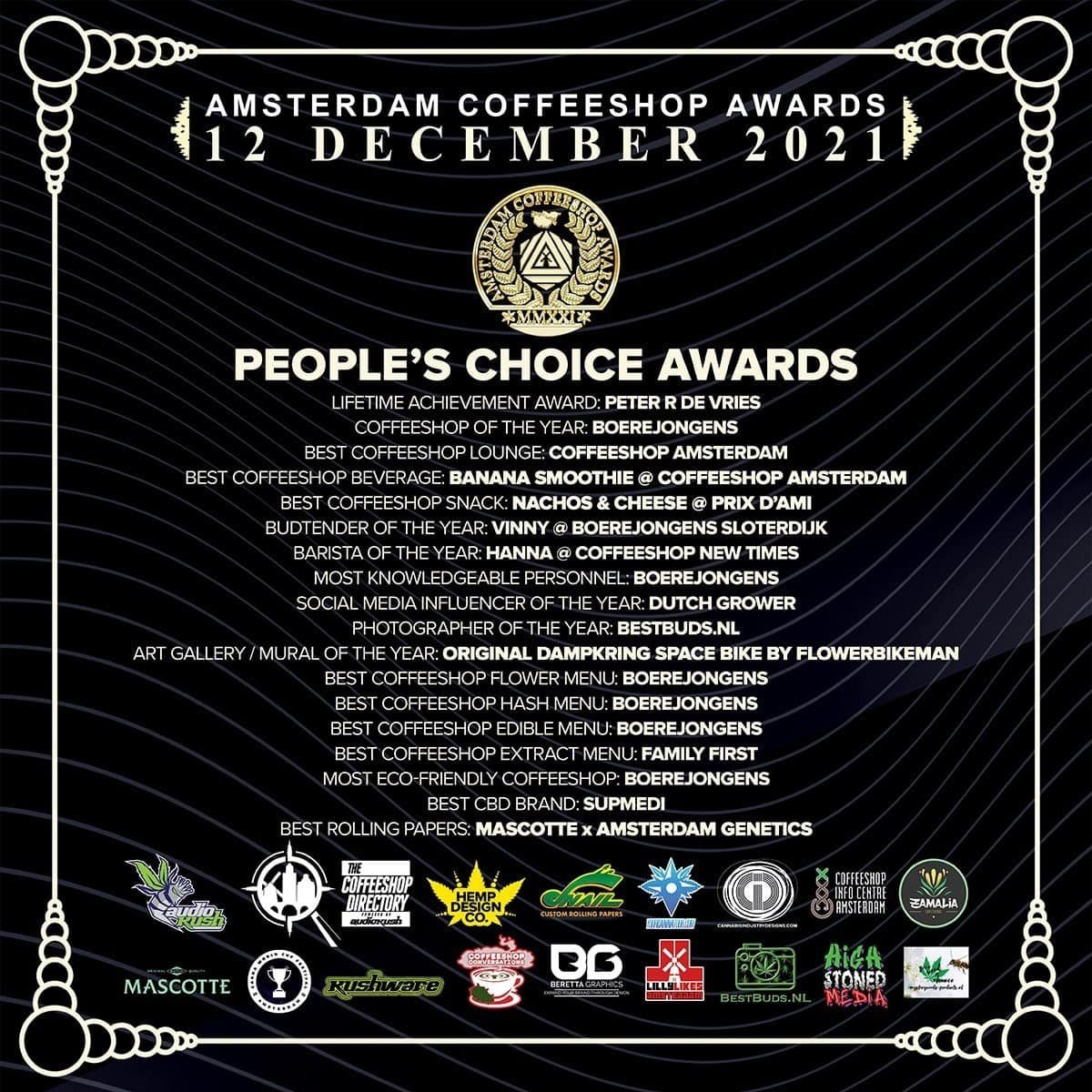 The 2021 Amsterdam Coffeeshop People’s Choice Awards were 100% community-determined accolades, awarded after the community nominated and then voted for their favorite cannabis industry businesses and leaders across 18 categories.