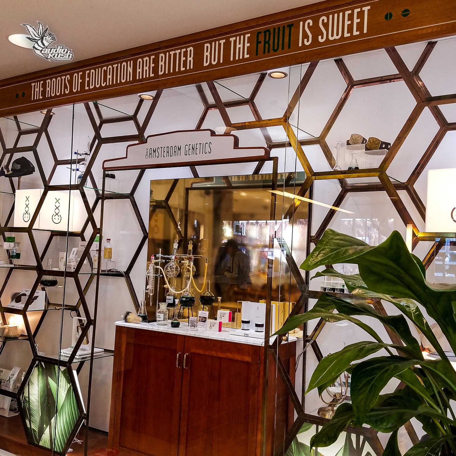 Boerejongens Bij is a member of the Boerejongens chain located in Amsterdam West. Before joining the Boerejongens family, the shop was known as Coffeeshop De Bij, “The Event”. This shop is a takeaway-only establishment with a distinctly museum-like feel. Informational displays as well as merchandise and Amsterdam Genetics products line the shop’s walls in glass displays while the front counters display digital, interactive menus. To complete the atmosphere, a wall of wooden specimen drawers belonging to a vintage archaeology closet hangs above the front counter. A fine selection of Amsterdam Genetics products can be found on the Boerejongens Bij menu as well as the well-known gourmet Spacetry. While there is no smoking room at Boerejongens Bij, there is a raised table with stools where guests can roll up before leaving the shop.