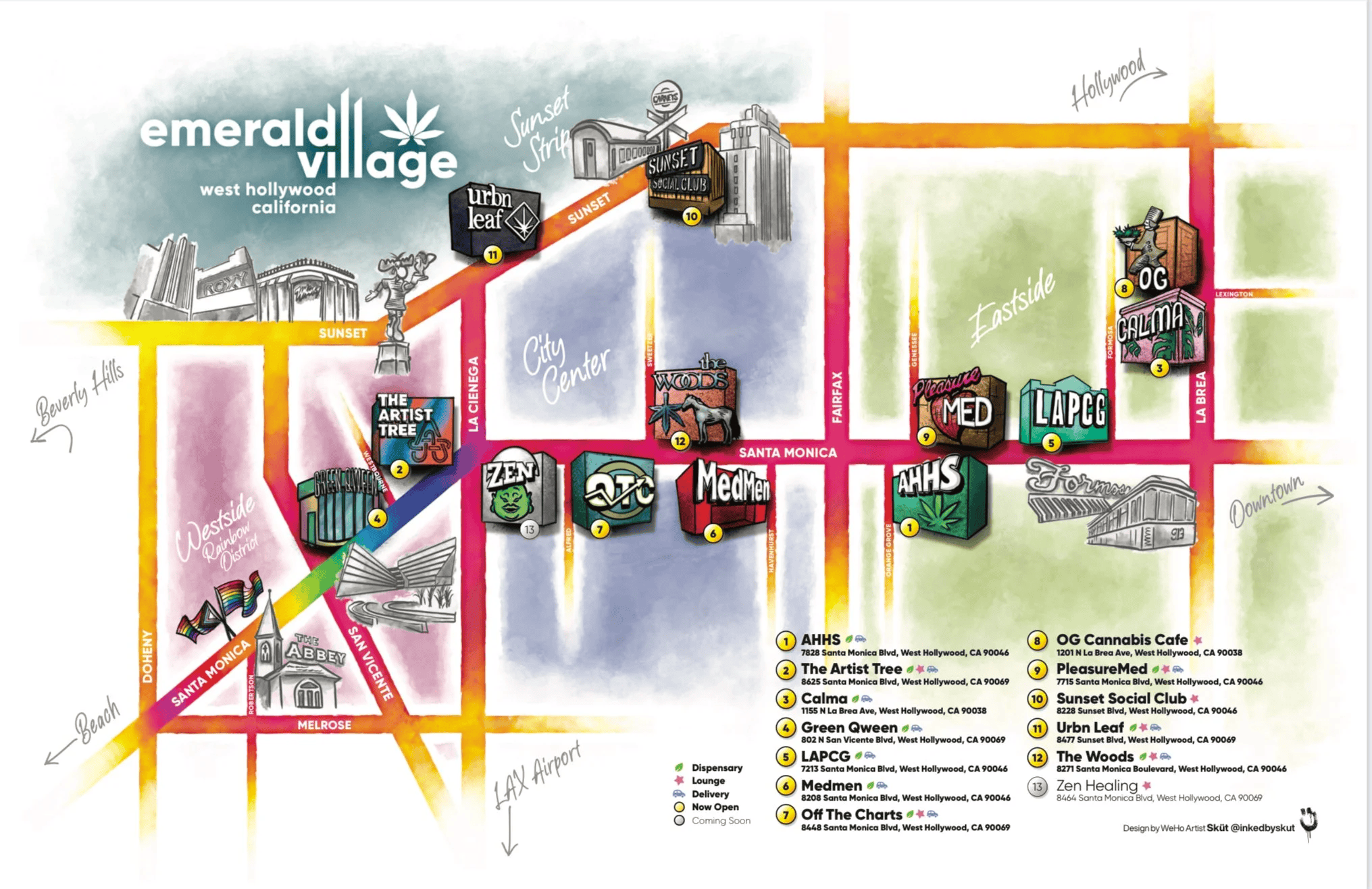 The Emerald Village West Hollywood features several licensed dispensaries and consumption lounges permitted under local municipal ordinances. As West Hollywood has established specific regulations to allow for social consumption sites, the district has become a destination for individuals interested in the legal cannabis industry and retail culture in Southern California. The village often serves as a hub for local events and tourism centered around the legalized cannabis market in the state.