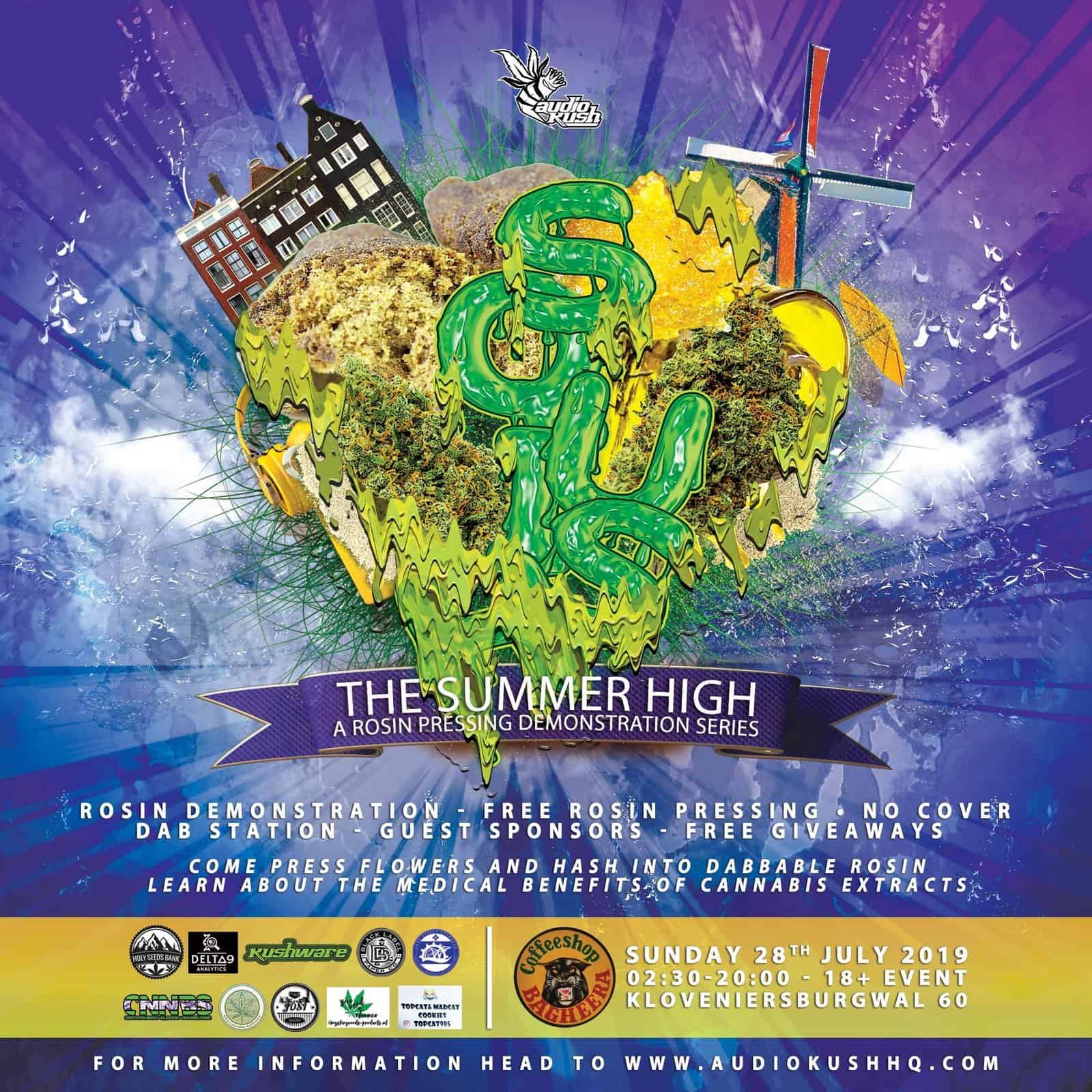28 July, Audio Kush heads to Coffeeshop Bagheera where we will be hosting another installment of our live rosin pressing series, “Squish the Summer High”! Holy Seeds Bank will be raffling away free seeds to lucky attendees and Top Cat Edibles will be providing free giveaways. Be sure to sample Bagheera’s phenomenal products after they are pressed into dabbable rosin at the Kushware-powered dab station.